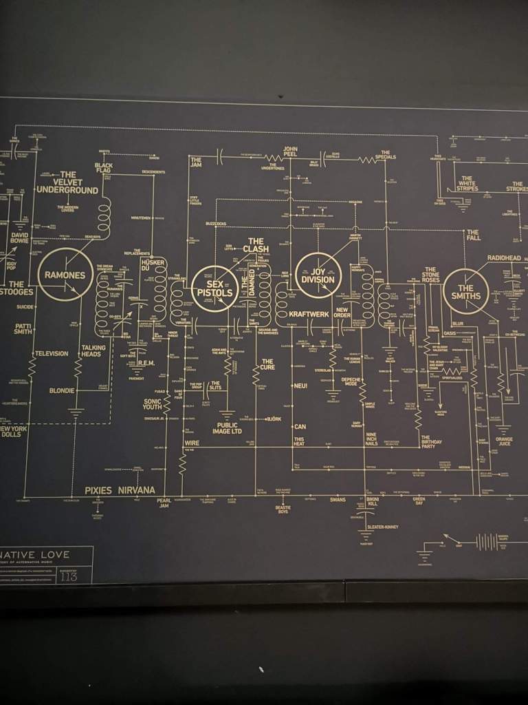 Another concept that Dorothy have put a thoughtful spin on is the ‘Rock Family Tree’ format. In their ‘Love Blueprint’ collection, the connection between bands, promoters, managers and venues are explored as electrical blueprints. Genres tackled include Alternative, Electronic, Acid House, and Hip-Hop. The attention to detail is astounding. The Hacienda D.J. Graeme Park was contacted to proof read the ‘Acid House Love Blueprint’. It is even available in a Hacienda warning yellow and black colourway for added authenticity. If I had to pick a favourite piece on show at this exhibition it would be ‘Alternative Love Blueprint’. It covers my favourite music genres, it is intricate, detailed and accurate, and the metallic gold font on navy-blue background gives a feeling of alternative opulence.