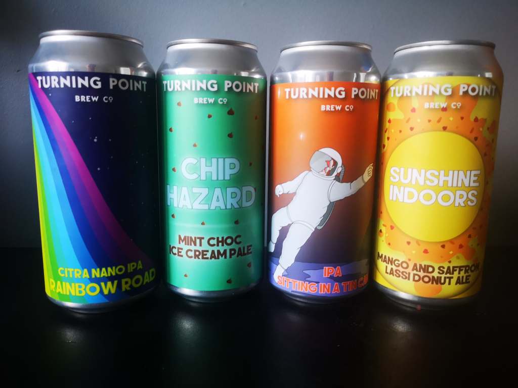 For this tasting session, we bought four of the current popular Turning Point range available from their webshop. Rainbow Road (3% Nano IPA), Chip Hazard (5.7% Mint Choc Pale), Sitting In A Tin Can (5.5% IPA) and Sunshine Indoors (6.0% Mango and Saffron Lassi Donut Ale).