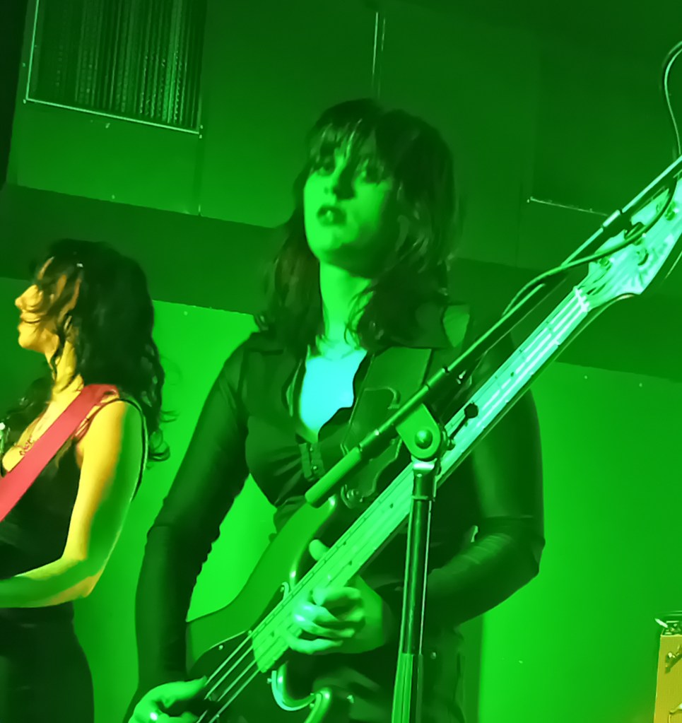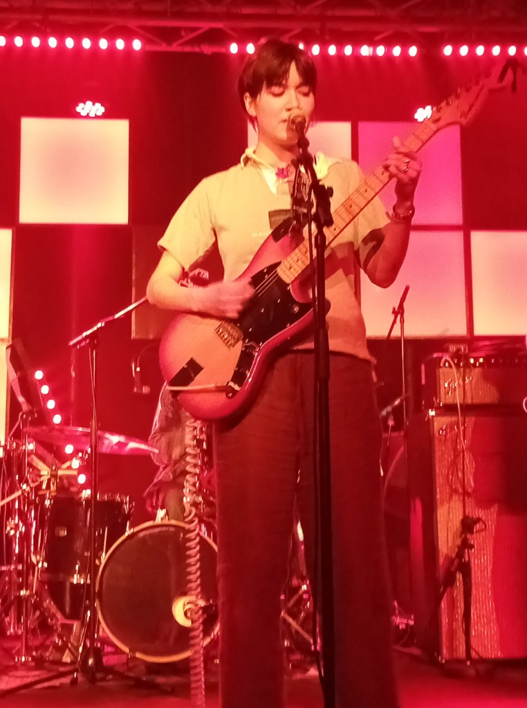 By the end of Hot Wax‘s set I wished that I could have seen a Sky Sports type ‘Heat Map’ for the amount of stage covered by singer/guitarist Tallulah Sim-Savage, and bassist Lola Sam. They metaphorically covered every blade of grass and worked their socks off. Drummer Alfie Sayers played a blinder at the back and was a faultless libero, coming to the fore when the occasion arose.